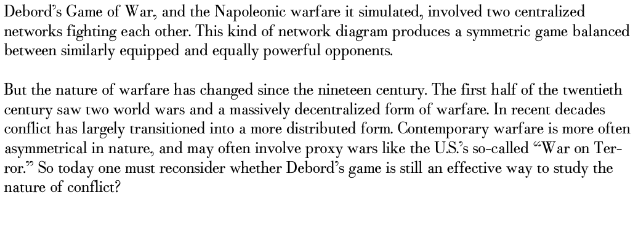 Galloway emphasizes the decentralized nature of 20th century wars and projects towards a game